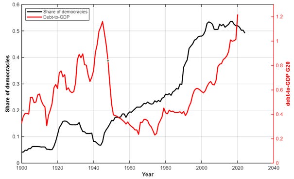 Note: during the interwar years (1920–50), debt rose sharply and democracy faltered. Echoes of today? Since 2000, debt-to-GDP climbs, but democracy stagnates and (perhaps) slides.
