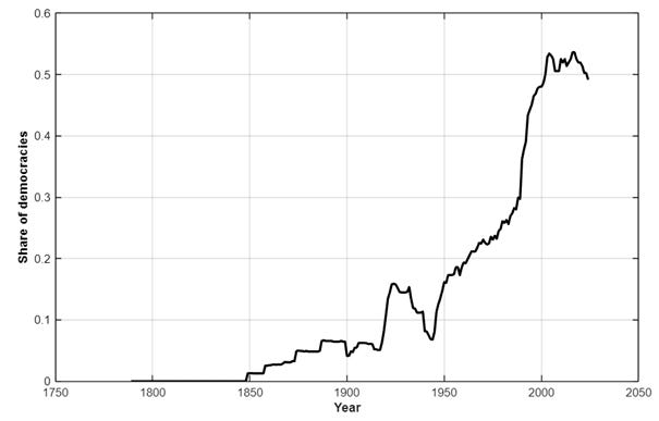 Fig. 2: Share of countries that are electoral or liberal democracies.
