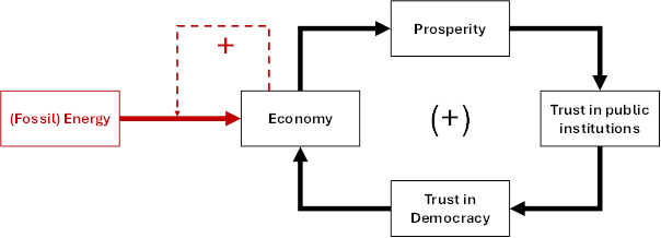 Fig. 4: Simple system dynamics model showing the connection between democracy, economic growth and (fossil) energy.