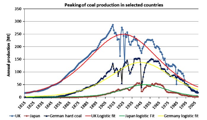 Is it going to happen? History tends to rhyme, although it never repeats itself. In the 1930s, Germany could still create a military industry on a par with the other military powers of the time, mainly Britain, because it still had abundant coal reserves. Its coal production matched that of Britain, which was already on a descending trajectory (see a post of mine on Cassandra’s Legacy. (figure below from “The Oil Drum”)
