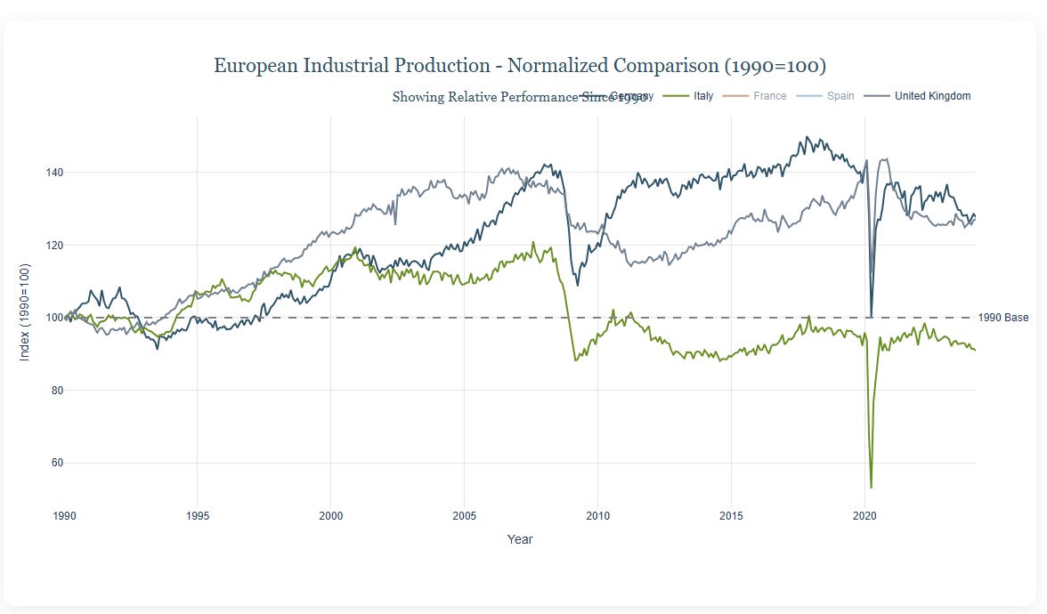 The disaster is not going to remain limited to Germany. It is reverberating throughout the whole European system. After Britain left the EU, Germany gained a larger share of the European Economy. Germany accounts for 24% of the EU GDP and 26% of the EU industrial production. Now, we can reasonably say that Europe is Germany, plus minor states. Apart from Britain, which is collapsing in parallel with Germany, so far, the other components of the union have been able to survive the collapse better because they were not so heavily based on car exports. But they are not doing well, either (below, data sourced by kimi.ai from FRED/OECD).