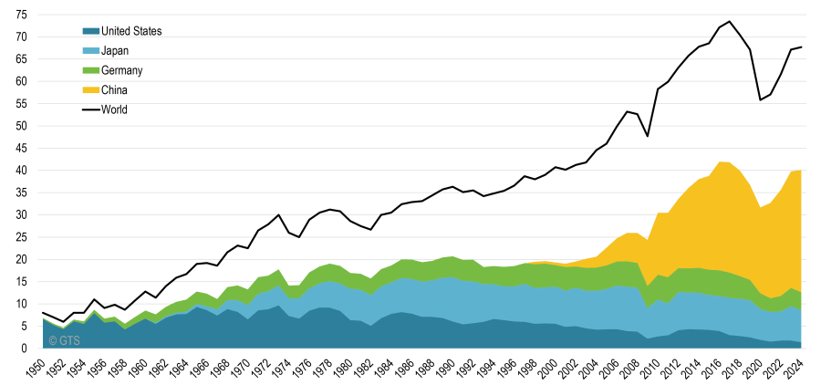 You see how China squashed all other car producers. They simply couldn’t compete with better and lower-priced cars. The effect was especially bad for Germany, which was caught with her pants down, still trying to sell obsolete cars running on thermal engines. China, instead, bet everything on electric cars and is winning the battle worldwide. You see the German disaster in a graphical form below.