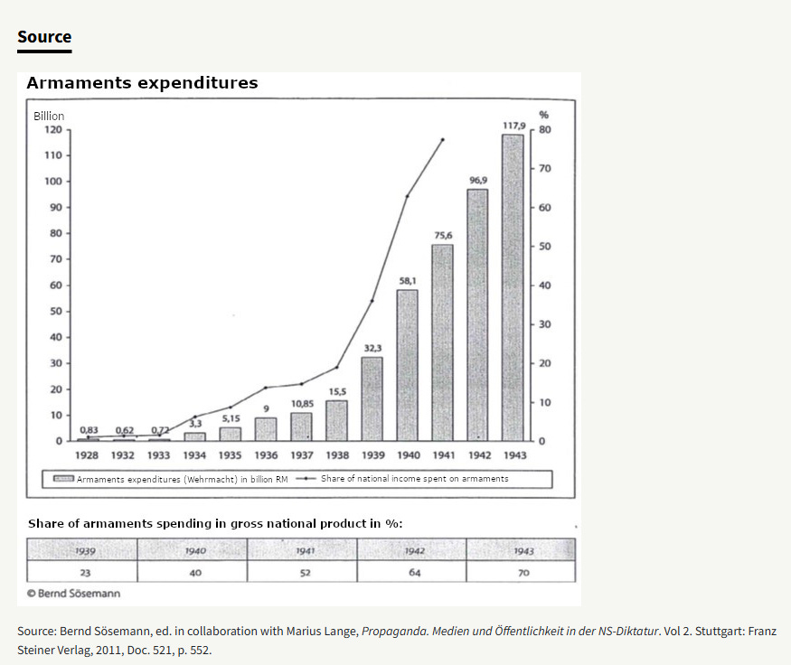 As soon as the Nazis took power, they started increasing military expenditures until, some ten years later, they had become a hundred times larger than at the beginning. At that point, nearly 80% of the national income went into weaponry. Total madness, of course, but it happened. Governments are dumb beasts, and cruel, too.
